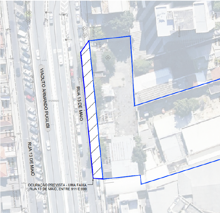 Caso ocorra fila de caminhões, uma faixa da Rua Treze de Maio, entre os números 911 e 999, será utilizada como estacionamento das betoneiras, conforme croqui abaixo.