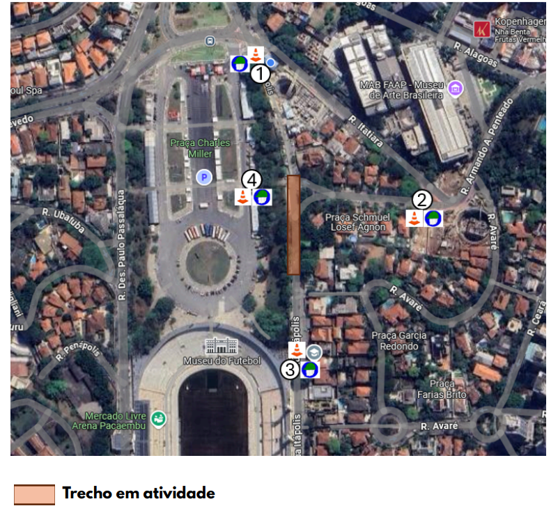 Ponto 1 – Entrada do Canteiro, Rua Itápolis com Praça Charles Miller.