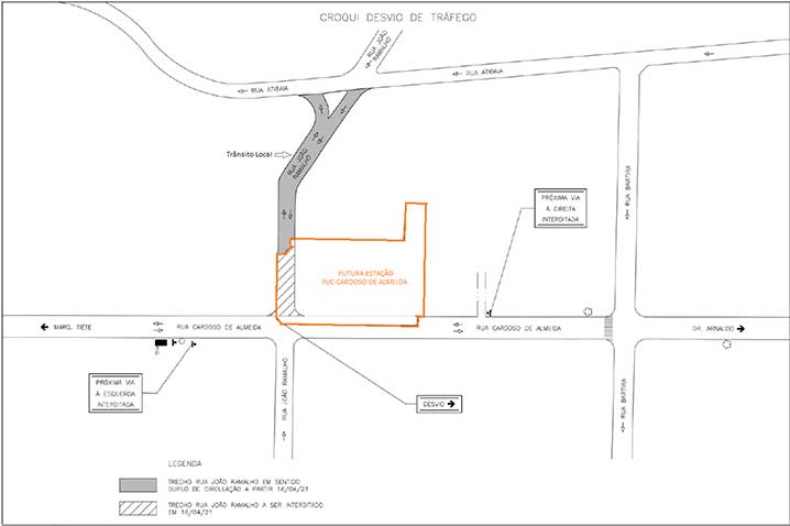 Haverá ainda, a interdição total da Rua João Ramalho, no trecho do canteiro de obras, entre a Rua Cardoso de Almeida e a Rua Atibaia, mantendo o acesso lateral para circulação de pedestres na calçada da Fundação São Paulo. Neste trecho, a via terá circulação nos dois sentidos, para o fluxo local.