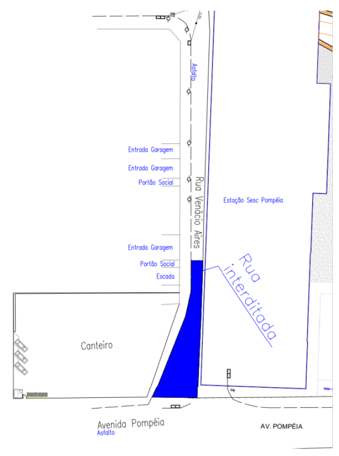 Em razão das obras de construção da Linha 6- Laranja de metrô, a interdição parcial na Rua Venâncio Aires com o cruzamento da Av. Pompéia, anteriormente programada para término dia 22/09/2022 deverá se estender até 22/10/2022, conforme imagem abaixo: