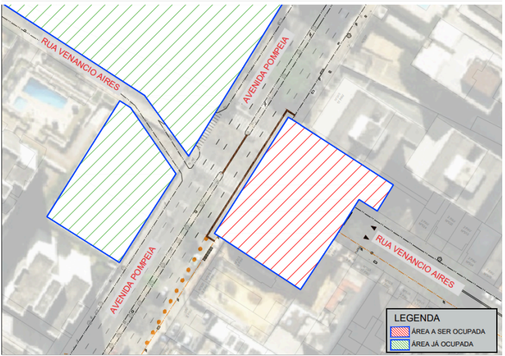 Em razão das obras de construção da Linha 6-Laranja de metrô, a partir de 10/06/2024 haverá interdição na Avenida Pompeia entre os números 259 e 299, com a Rua Venâncio Aires na altura dos números 531 (lado ímpar) e 542 (lado par) para a construção do futuro acesso da Estação Sesc Pompeia, conforme croqui abaixo:
