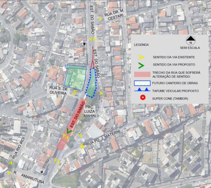 Em razão das obras de construção da Linha 6-Laranja de metrô, a partir de 03/05/2022 haverá continuidade das atividades de interdições e alterações de sentidos da Estrada do Sabão que passará a ser mão única entre as Ruas Saldanha de Oliveira e Padre José Materni. Haverá acesso para pedestres ao redor de toda área interditada.