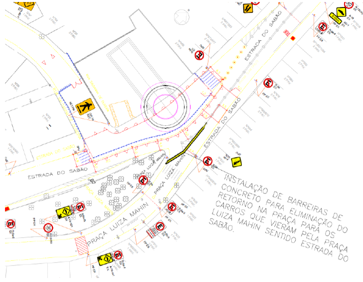 Em razão das obras de construção da Linha 6-Laranja de metrô, a partir de 29/06/2022 haverá continuidade das atividades de interdições e alterações de sentidos de vias na Estrada do Sabão, entre as Ruas Saldanha de Oliveira e Padre José Materni, que passará a ser mão única. Haverá acesso para pedestres ao redor de toda área interditada, conforme o croqui abaixo.