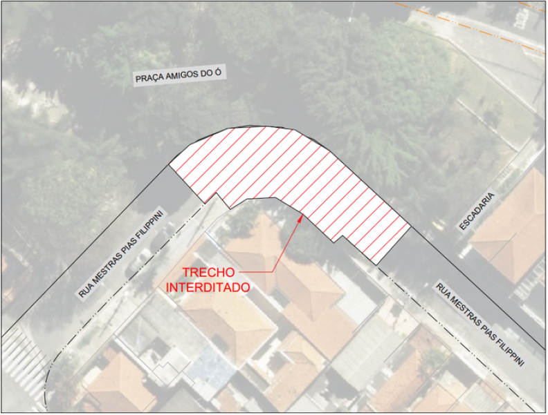 Em razão das obras de construção da Linha 6-Laranja de metrô, informamos que a interdição temporária da Rua Mestras Pias Filippini, do nº 194 ao nº 271, que seria finalizada no dia 31/01/2024 se estenderá até o dia 15/02/2024,conforme croqui abaixo: