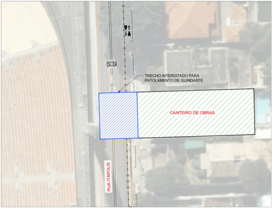 Em razão das obras de construção da Linha 6-Laranja de metrô, informamos que nos dias 02 e 03/12/2023 (sábado e domingo) haverá interdição total da Rua Itápolis, entre os números 589 e 593, em virtude da instalação e montagem do Pórtico para a construção da futura área de Saída de Emergência (SE) Itápolis, conforme croqui abaixo: