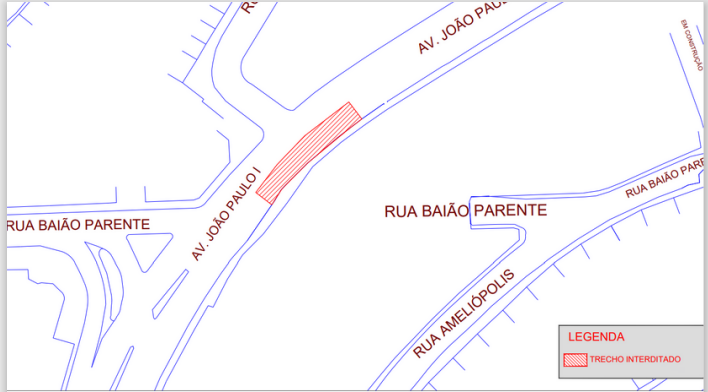 A atividade está prevista para ser realizada nos dias 17, 18 e 19/04/2024, das 21h às 0h. Será necessária interdição parcial da Av. João Paulo I, próximo a rua Baião Parente, conforme croqui abaixo: