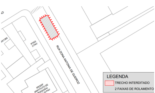 Em decorrência desta atividade, haverá circulação de veículos e funcionários da obra, além de utilização de maquinários. Medidas para reduzir impactos serão adotadas, como: isolamento de duas faixas da Rua Dona Antônia de Queirós, conforme croqui abaixo: