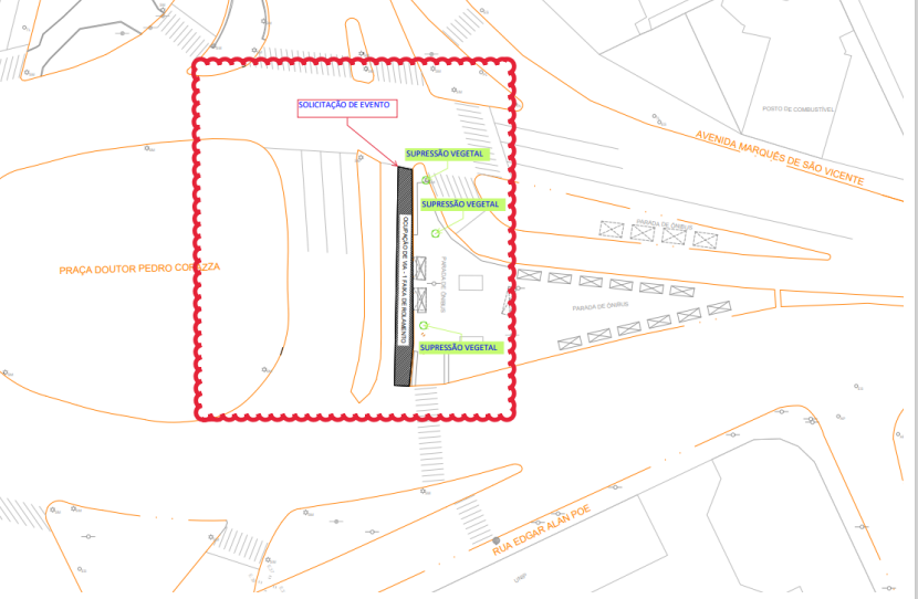 A supressão arbórea do acesso 3 será a partir de 03/02/2024, e para a supressão das árvores próximo ao corredor de ônibus será necessário a ocupação da faixa, conforme croqui abaixo: